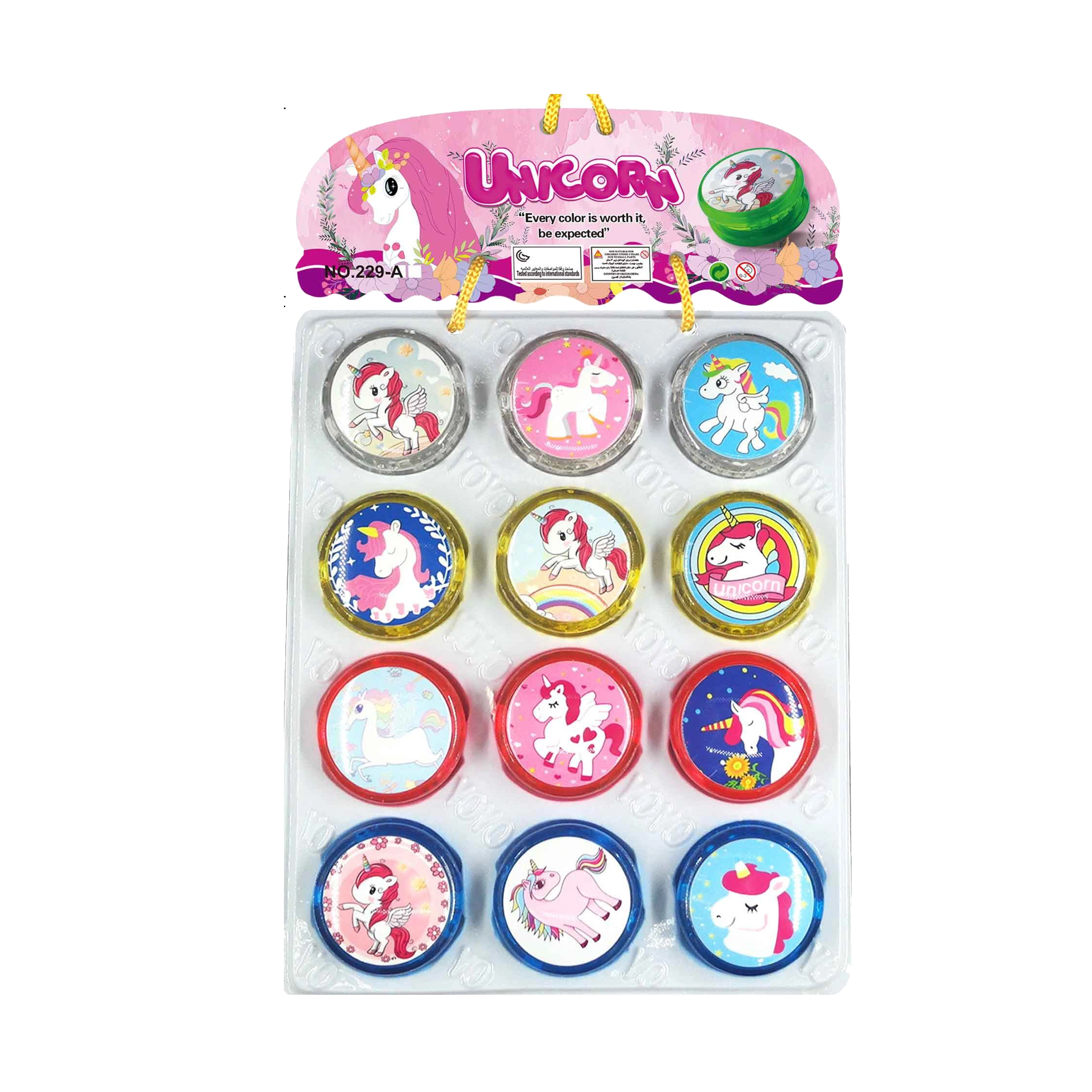 Divertido yo-yo con motivo de unicornio que ofrece efectos de luz en cada giro. Ideal para niños a partir de 3 años, diámetro de 5,5 cm, baterías 2x AG3 incluidas.