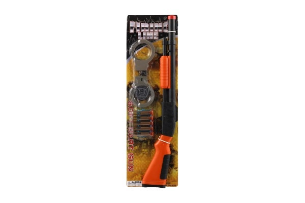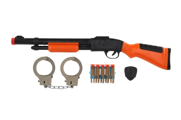 El set contiene todo lo necesario para jugar a ser policía, incluyendo un rifle, balas, esposas y una placa.
