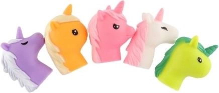 Este set incluye cinco unicornios de goma en distintos colores, cada uno con un diseño y expresión únicos. Están hechos de material de alta calidad, lo que asegura su durabilidad y seguridad durante el juego.