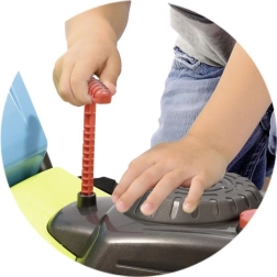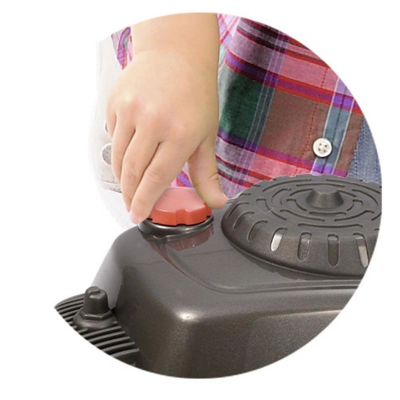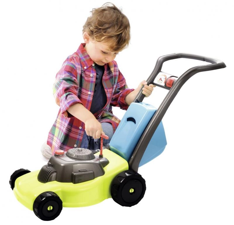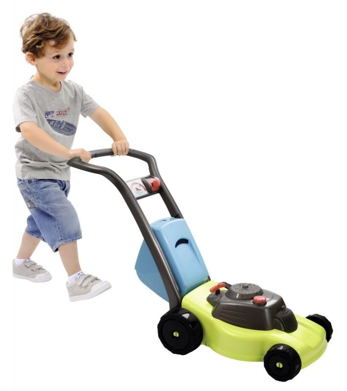 Incluye una cesta azul extraíble, que puede colocarse en el compartimento interior o colgarse del manillar. El realismo se completa con la imitación del interruptor de modo y el “tirador” rojo: al insertarlo y tirar, el cortacésped emite un característico sonido de arranque, haciendo el juego aún más divertido.
