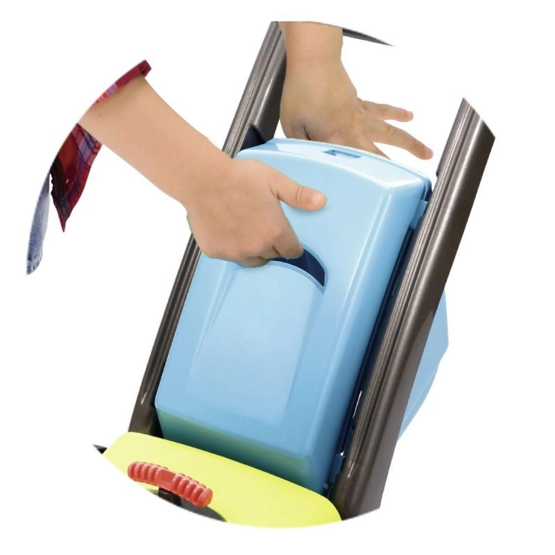 La cesta azul se puede retirar fácilmente y colgar en el manillar. Los niños pueden “recoger el césped” y mejorar sus habilidades motoras.