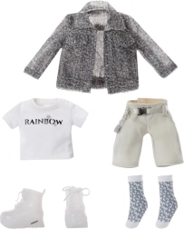 El set incluye varias prendas que pueden combinarse entre sí: desde camiseta y americana hasta shorts, calcetines y botas con cordones. Ideal para infinitas variaciones de estilo.