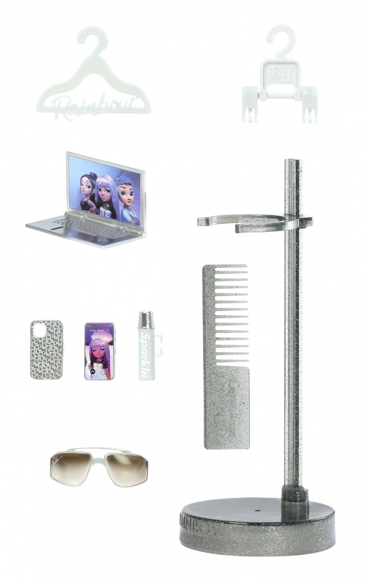 Base transparente, peine, perchas, gafas, teléfono con funda y mini portátil: todo para escenas creativas y fashion storytelling.