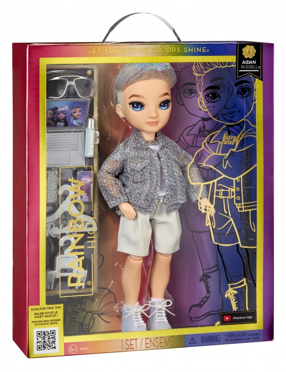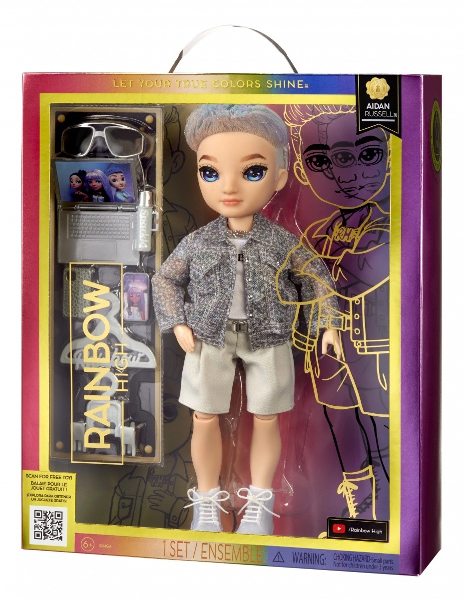 Descubre el mundo de la moda con el RAINBOW HIGH Aiden Russell en estilo morado. El muñeco, de aproximadamente 22 cm de altura, destaca por el acabado detallado de su ropa y la posibilidad de posar gracias a sus extremidades articuladas. Los niños pueden combinar las prendas y crear innumerables looks.