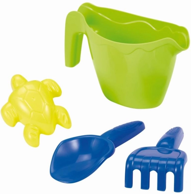 Camión de 33 cm que incluye una regadera, rastrillo, palita y molde para arena, ideal para juegos infantiles al aire libre.