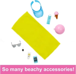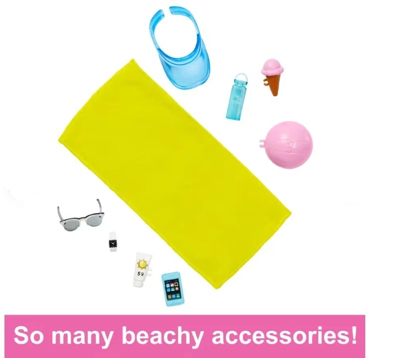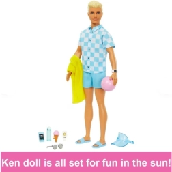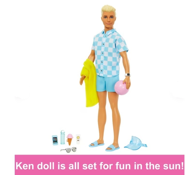 Ken es el compañero perfecto para aventuras playeras: desde relajarse en la toalla hasta jugar con el balón de playa. Accesorios como la visera, las gafas de sol o la crema solar fomentan el juego imaginativo y el desarrollo de habilidades sociales.