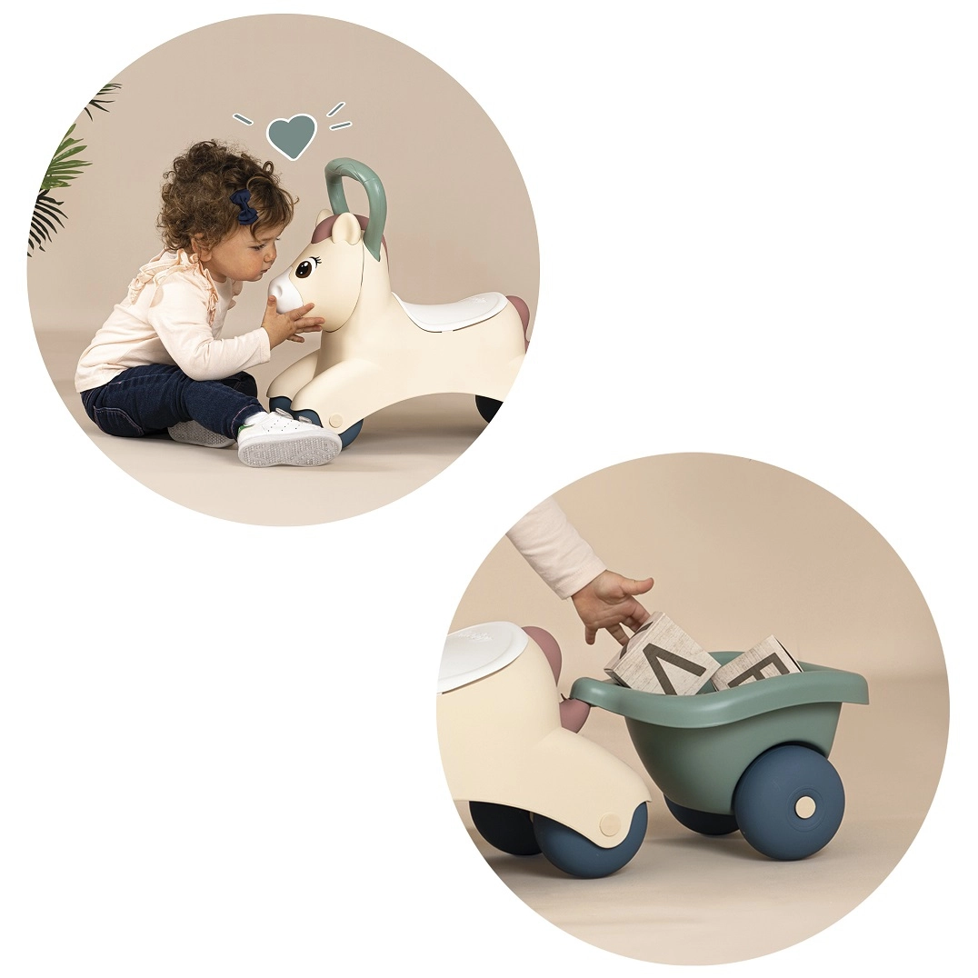 El correpasillos Smoby Little Pony con remolque es ideal para los más pequeños que están aprendiendo a caminar y desarrollar el equilibrio. Gracias al asiento cómodo y al remolque desmontable, los niños pueden transportar sus juguetes favoritos y pequeños objetos.
