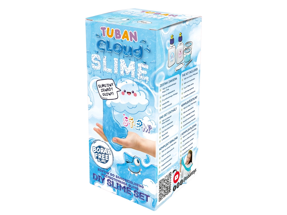 El set Tuban cloud slime es ideal para pequeños y grandes fans del slime. Gracias a los ingredientes cuidadosamente seleccionados, obtendrás un slime azul con una textura suave, esponjosa y nubosa, que recuerda a la nieve recién caída. Perfecto para manualidades, juego sensorial y desarrollo de la motricidad fina.