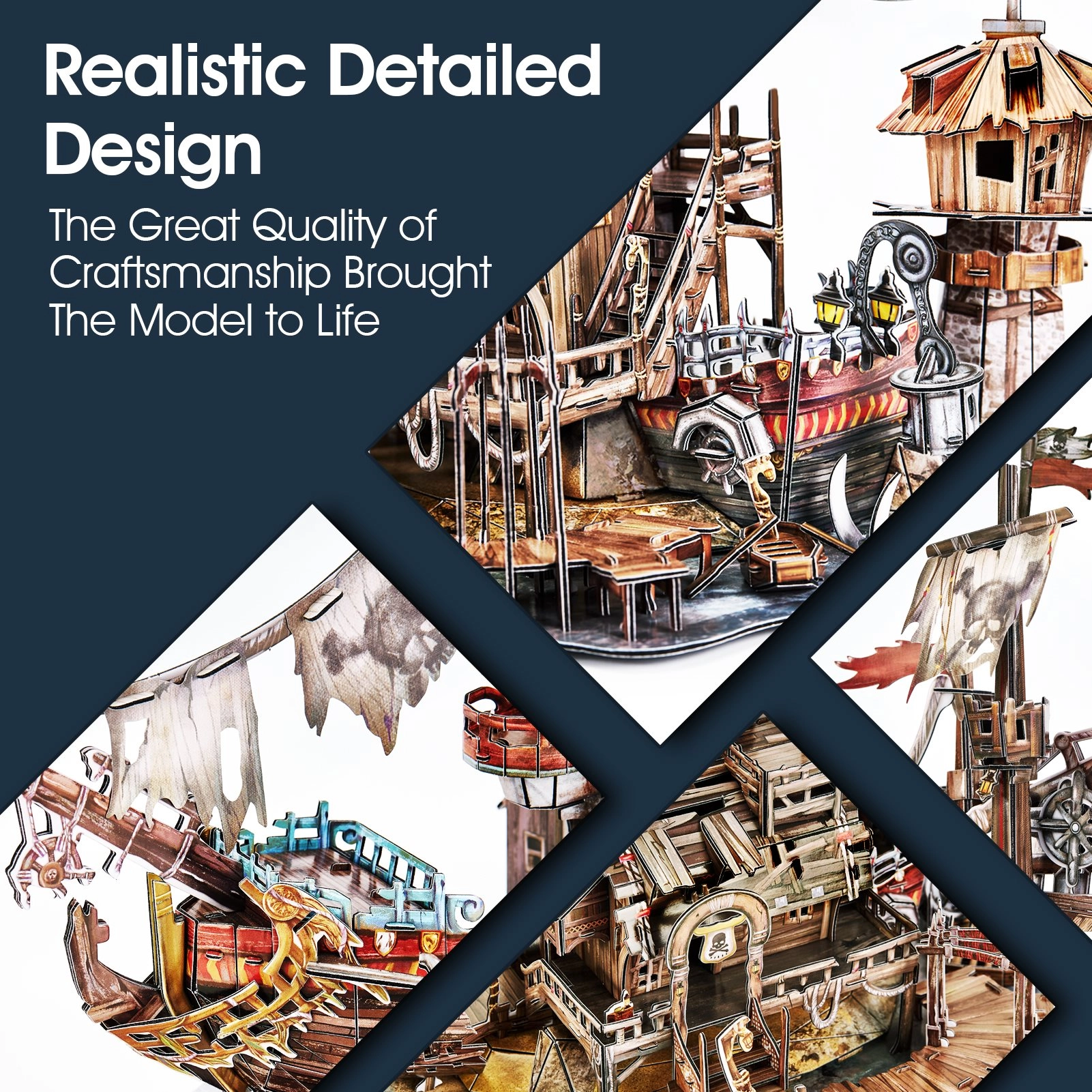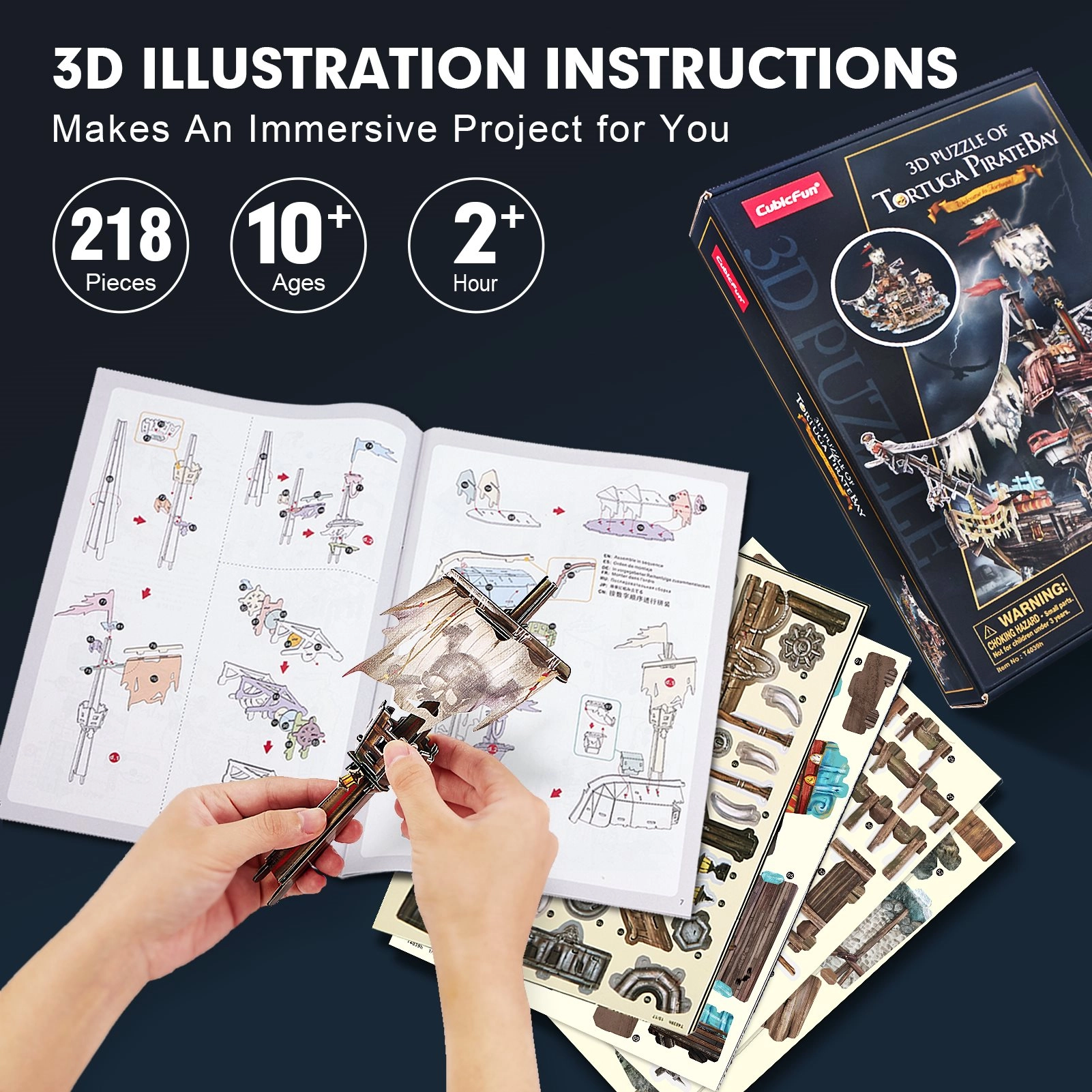 Descubre la magia de la bahía pirata y crea en casa una decoración impresionante con el rompecabezas 3D Puerto Pirata Tortuga. El modelo con dimensiones aprox. 48 × 27 × 38 cm ofrece detalles realistas que dan vida al mundo de los piratas. El montaje se realiza sin pegamento ni tijeras: las piezas precortadas se desprenden fácilmente de la plancha y se ensamblan siguiendo las instrucciones.