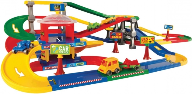 Este complejo de aparcamiento de la serie Play Tracks Garage tiene una estructura ligera que permite montar las pistas en diferentes formas y así hacer el juego del niño más variado. El set incluye un aparcamiento de dos niveles y una pista de once metros.