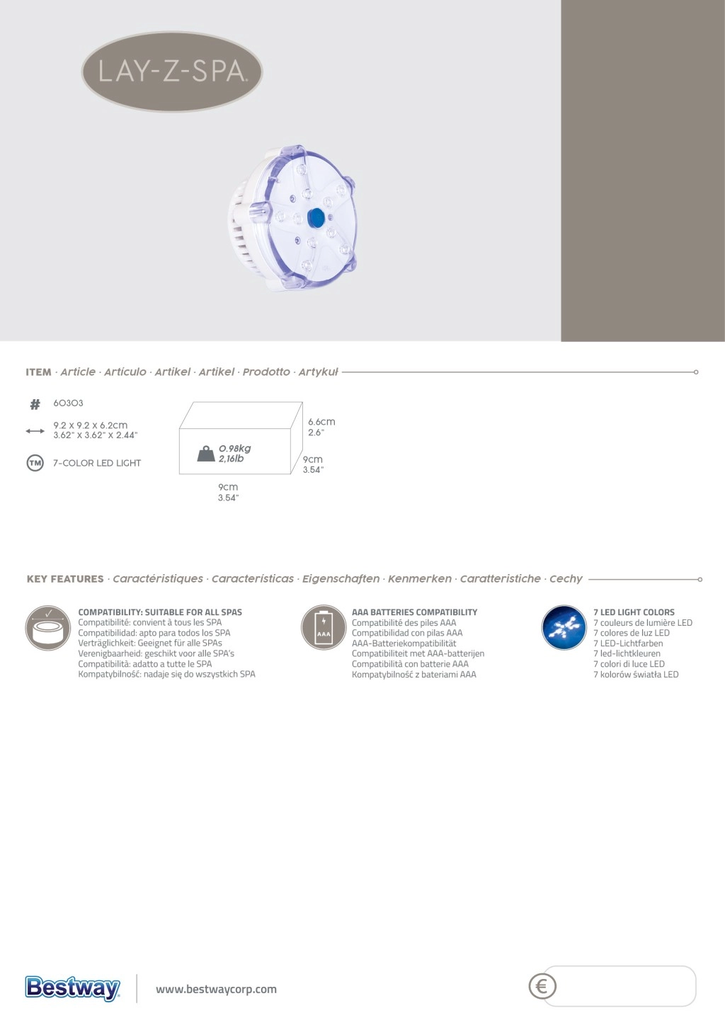 Esta lámpara LED para piscina Bestway proporciona una iluminación ingeniosa del agua, creando una atmósfera excepcional al anochecer. Gracias a sus siete colores de luz, tu piscina o jacuzzi tendrá un atractivo aspecto nocturno.