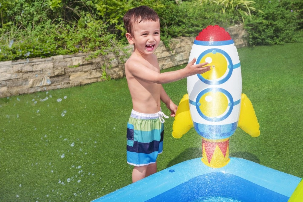 El parque inflable ofrece piscina, tobogán, rociador y un juego espacial de lanzamiento de aros que brindarán diversión durante horas.