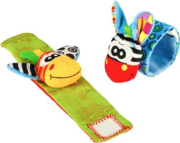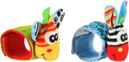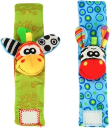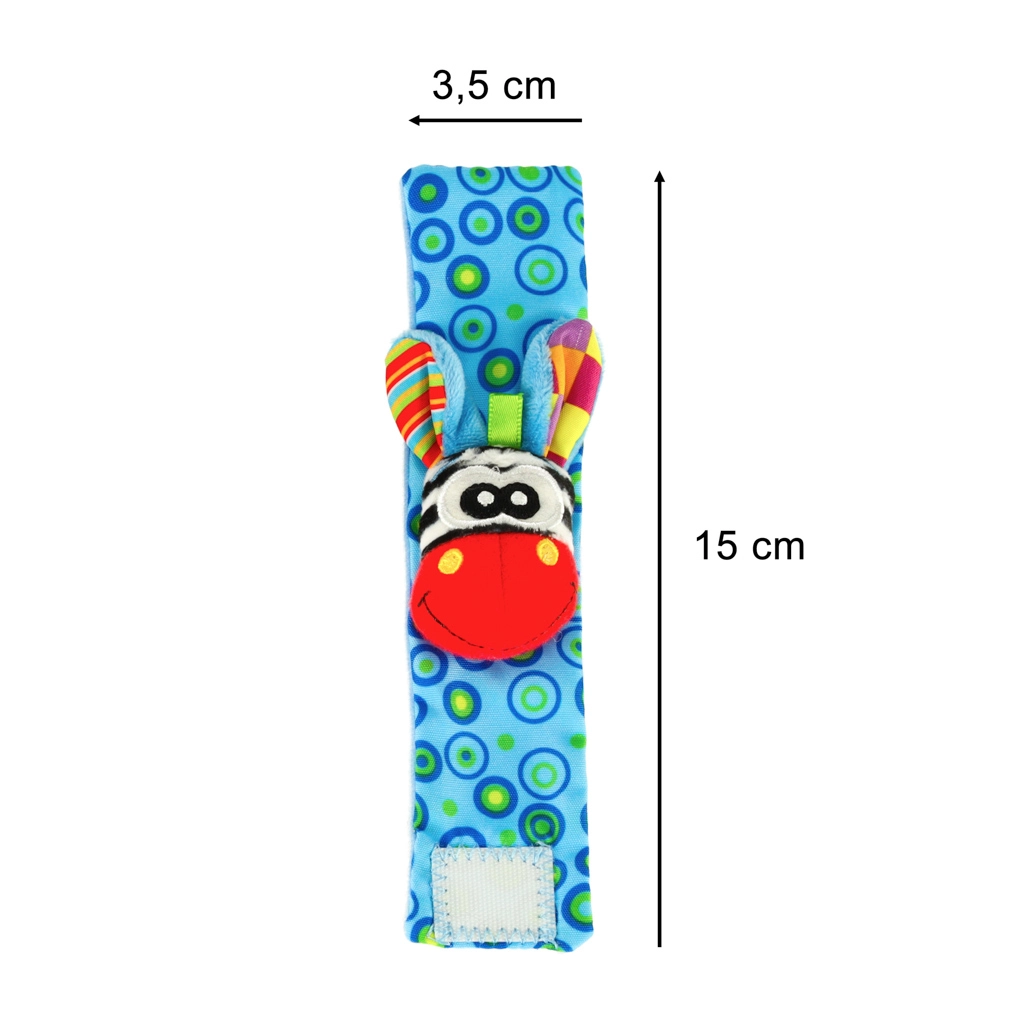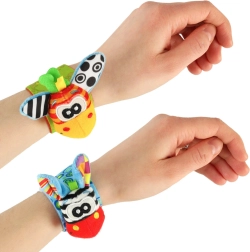 Las adorables pulseras con animalitos llaman la atención del bebé con colores y estampados en contraste, tejido suave y diversas texturas para el tacto. Cada movimiento de la mano se recompensa con un suave sonido de sonajero; además, las orejitas esconden láminas crujientes para más estímulos sensoriales.