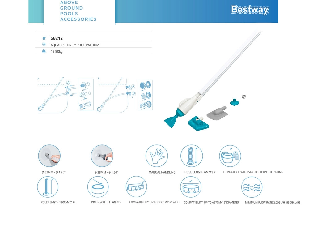 Mango de 1,9 m y manguera de succión de 6 m para limpiar fácilmente las superficies de la piscina.