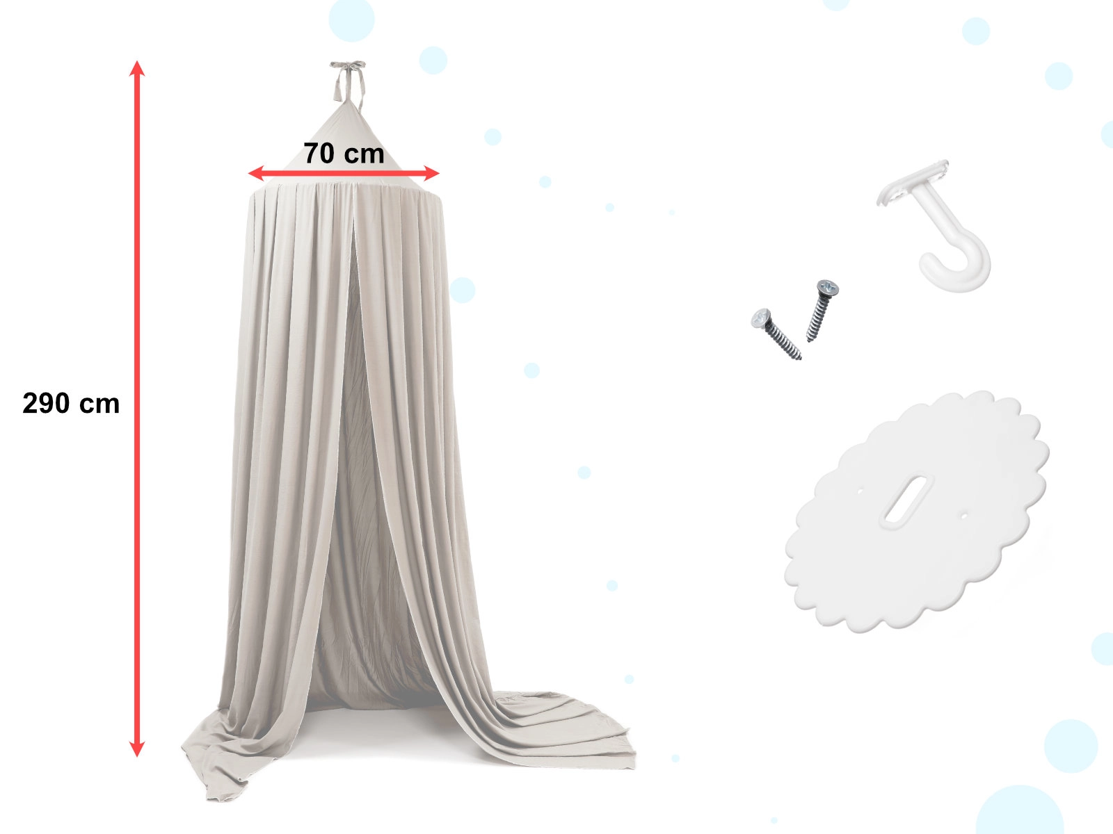 La instalación es sencilla: en el paquete encontrarás los accesorios necesarios para fijarlo al techo. La generosa anchura de la tela y el diámetro del dosel crean un espacio agradable y protegido donde los niños se sienten seguros.