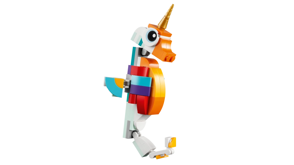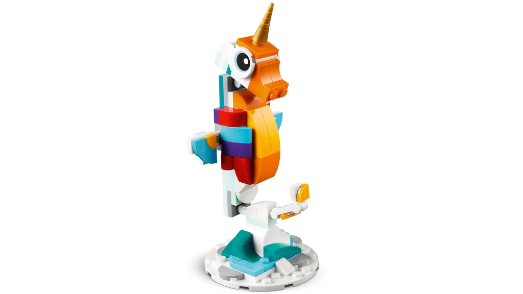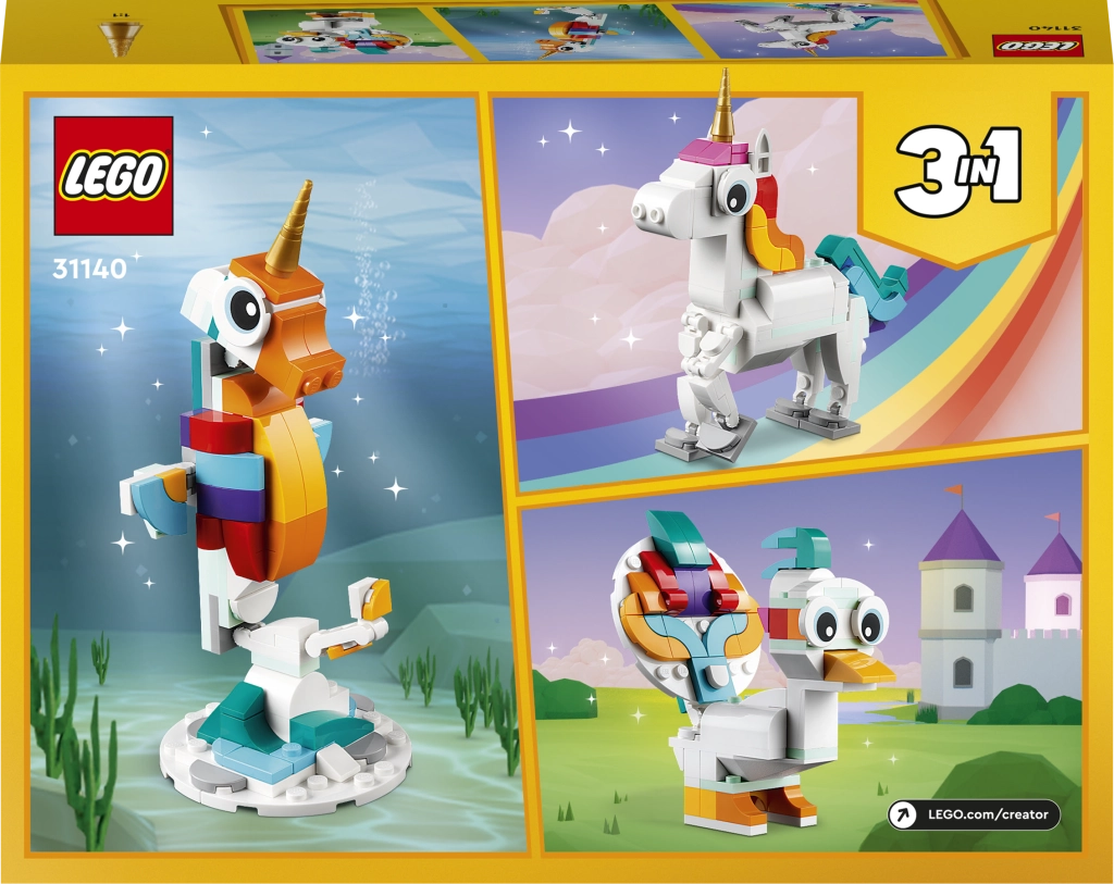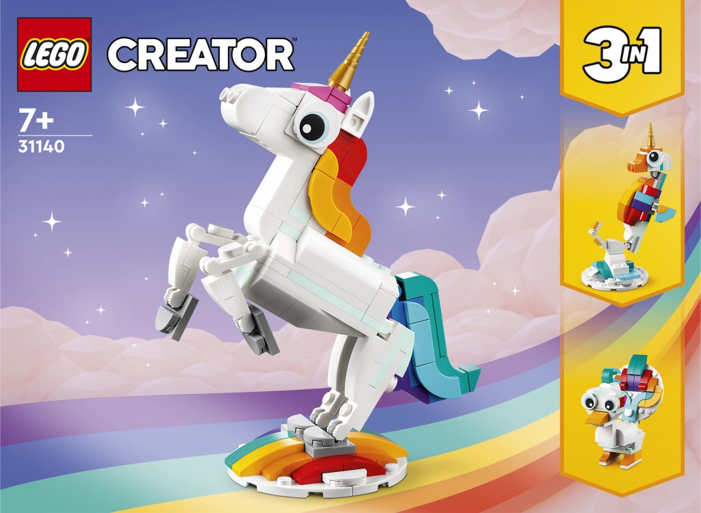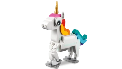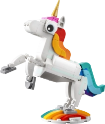 Descubre un mundo de fantasía con el set LEGO Creator 3 en 1 Unicornio mágico. Los niños a partir de 7 años disfrutarán construyendo y jugando con tres modelos en uno: un unicornio, un caballito de mar y un pavo real. Las partes móviles, el diseño colorido y la posibilidad de exponerlo en un soporte convierten cada juego en una aventura mágica.