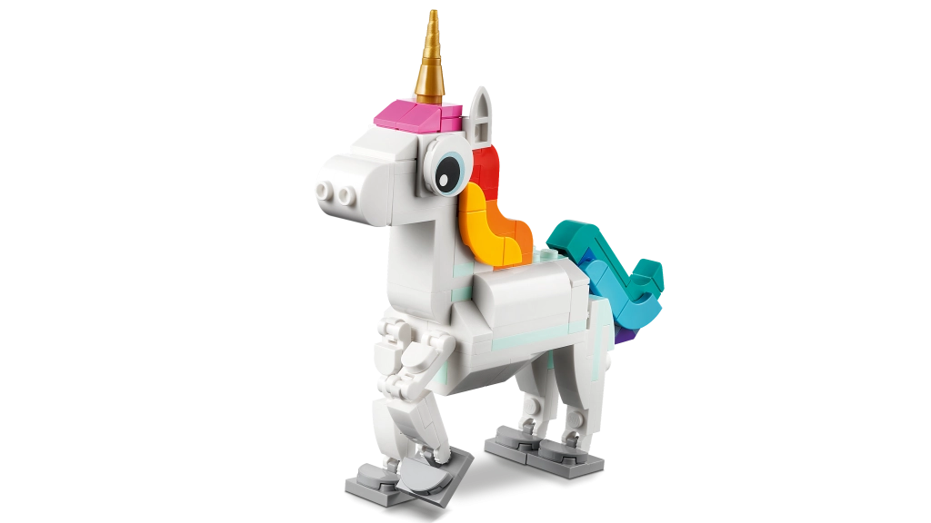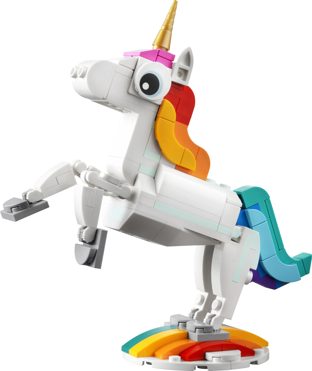 Con este encantador set, los niños construyen un adorable unicornio con cuerno dorado, cola arcoíris y piernas y pezuñas articuladas. El modelo puede exhibirse en una base arcoíris y colocarse en la pose tradicional sobre las dos patas traseras, o dejarlo de pie sobre las cuatro.
