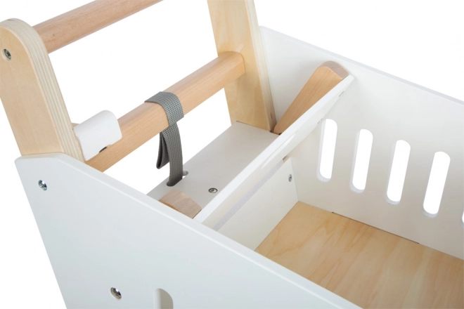 Este carrito de compras infantil está hecho de madera maciza y está equipado con ruedas engomadas para un movimiento silencioso y fluido. Al igual que en un supermercado real, cuenta con la posibilidad de usar una ficha magnética en el soporte. El carrito ofrece una cesta espaciosa para diversos objetos y espacio de almacenamiento adicional en la parte inferior.
