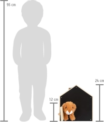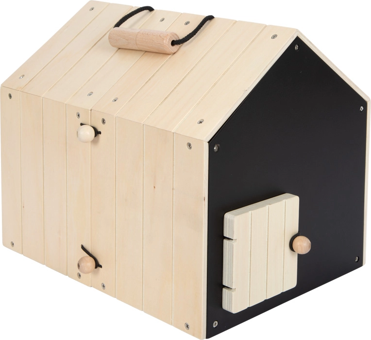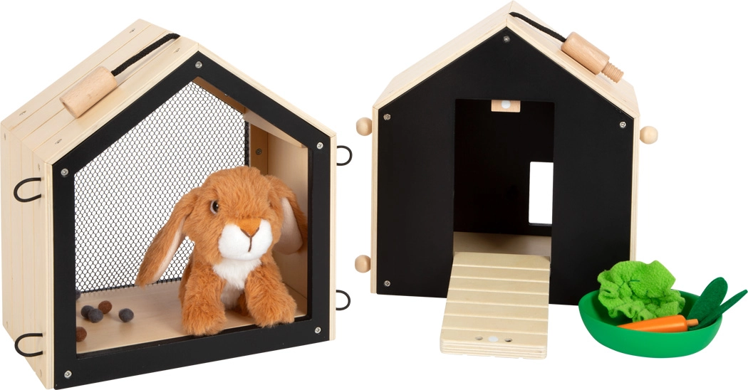 Esta conejera bien pensada, hecha de madera de calidad, ofrece dos casetas separadas: una para dormir tranquilamente y otra con ventanita enrejada para observar el entorno. A las casetas se conectan fácilmente vallas de malla para crear un corral exterior que hace el juego aún más divertido. La pared trasera negra se puede escribir con tiza, lo que aporta un plus de interacción creativa.