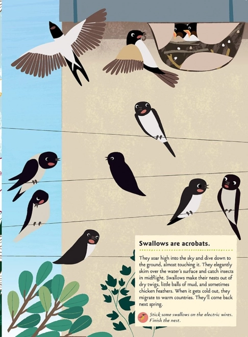 Incluye una selección de especies conocidas y exóticas —desde el ruiseñor y la golondrina hasta el loro, el tucán y el flamenco— y aporta datos curiosos (por ejemplo, sobre el pájaro más pequeño del mundo). El libro es ideal para manualidades en casa, viajes y actividades de tiempo libre.