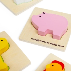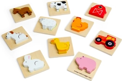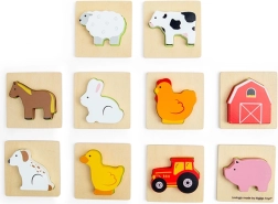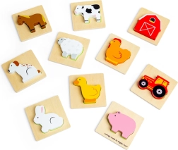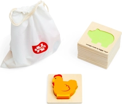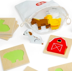Este juego de viaje con temática de granja brinda a los niños la alegría de descubrir. Introducen la mano en la bolsa de tela y, guiándose por el tacto, buscan la pieza que encaja en la base de madera correspondiente. Una diversión que fomenta de forma natural la concentración, la coordinación ojo–mano y el vocabulario al nombrar animales y objetos de la granja.