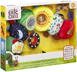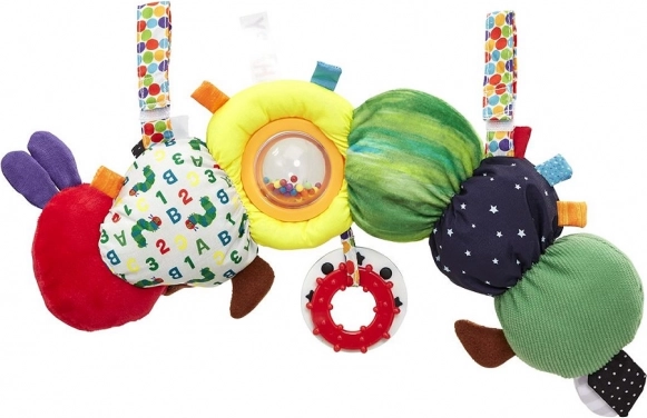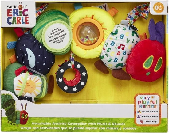 El querido personaje del cuento La oruga muy hambrienta cobra vida como un colorido peluche textil lleno de actividades que estimula los sentidos, apoya el desarrollo temprano y entrena la motricidad fina. La oruga se retuerce, suena como un sonajero y reproduce la nana «Brilla, brilla, estrellita». Gracias a las diferentes texturas, al espejo, a las etiquetas y al anillo de enganche, entretiene al bebé en casa y durante los paseos.