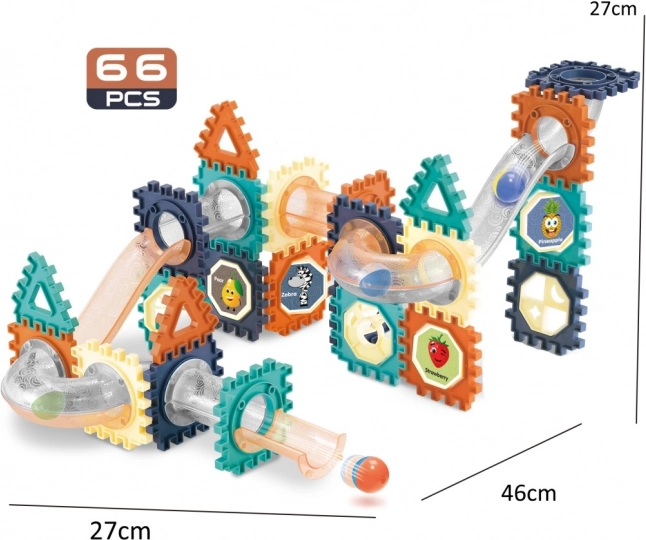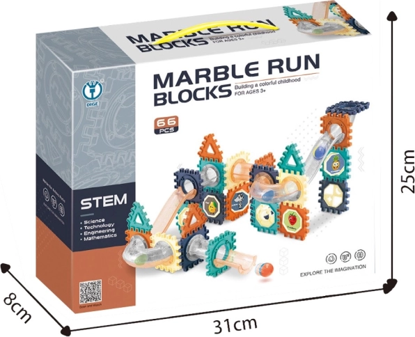 El set de construcción de pista de canicas con 66 piezas ofrece espacio para la fantasía y las habilidades técnicas. Monta circuitos originales con diferentes curvas, inclinaciones y obstáculos, construye túneles y puentes, o crea toda una pequeña ciudad. Cada nuevo montaje aporta una experiencia distinta y motiva a los niños a experimentar.