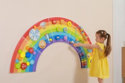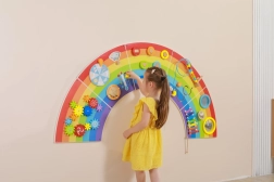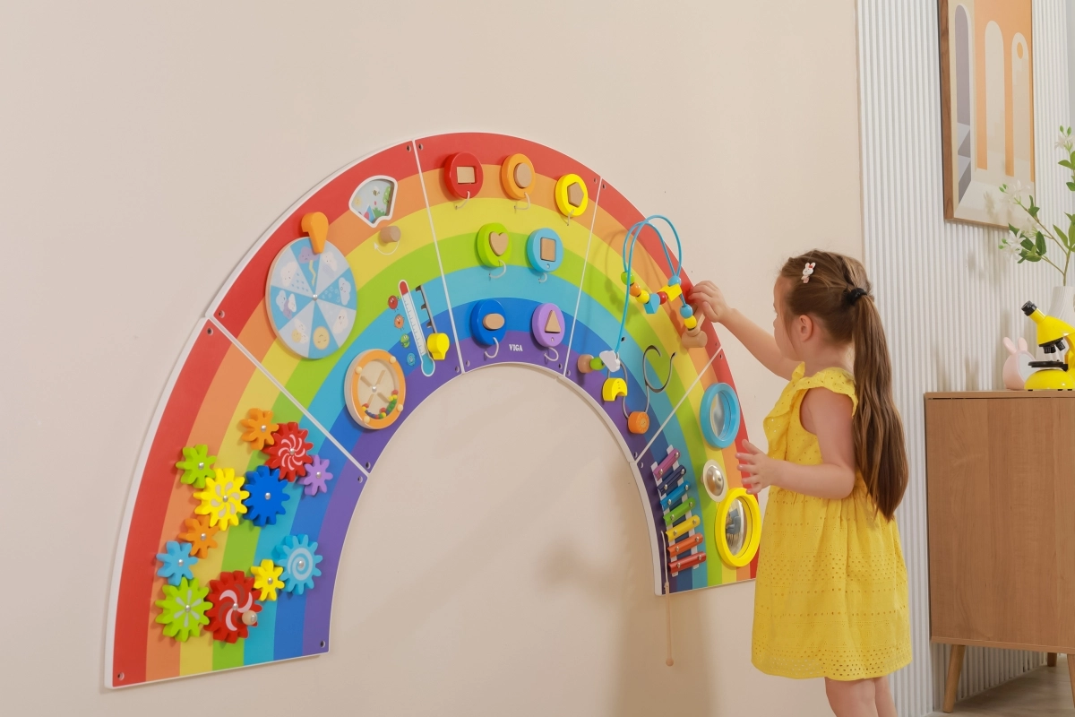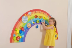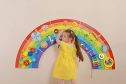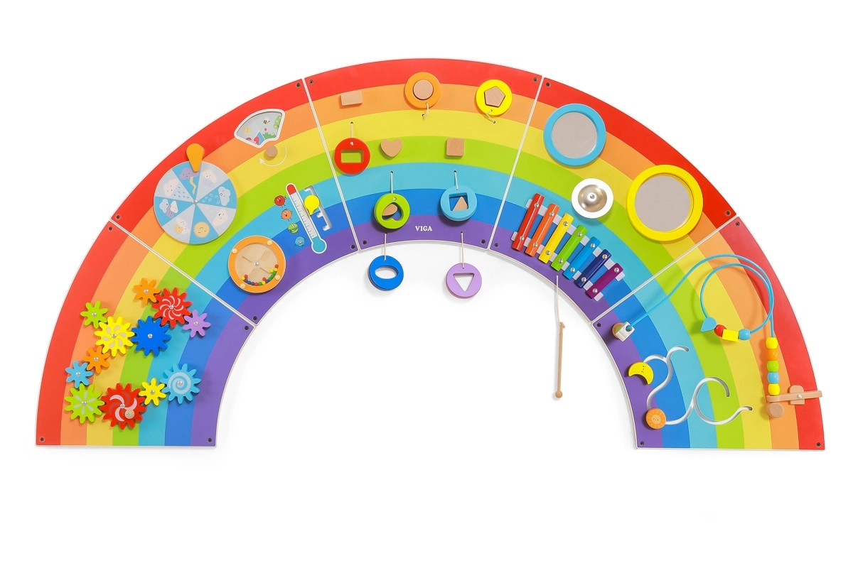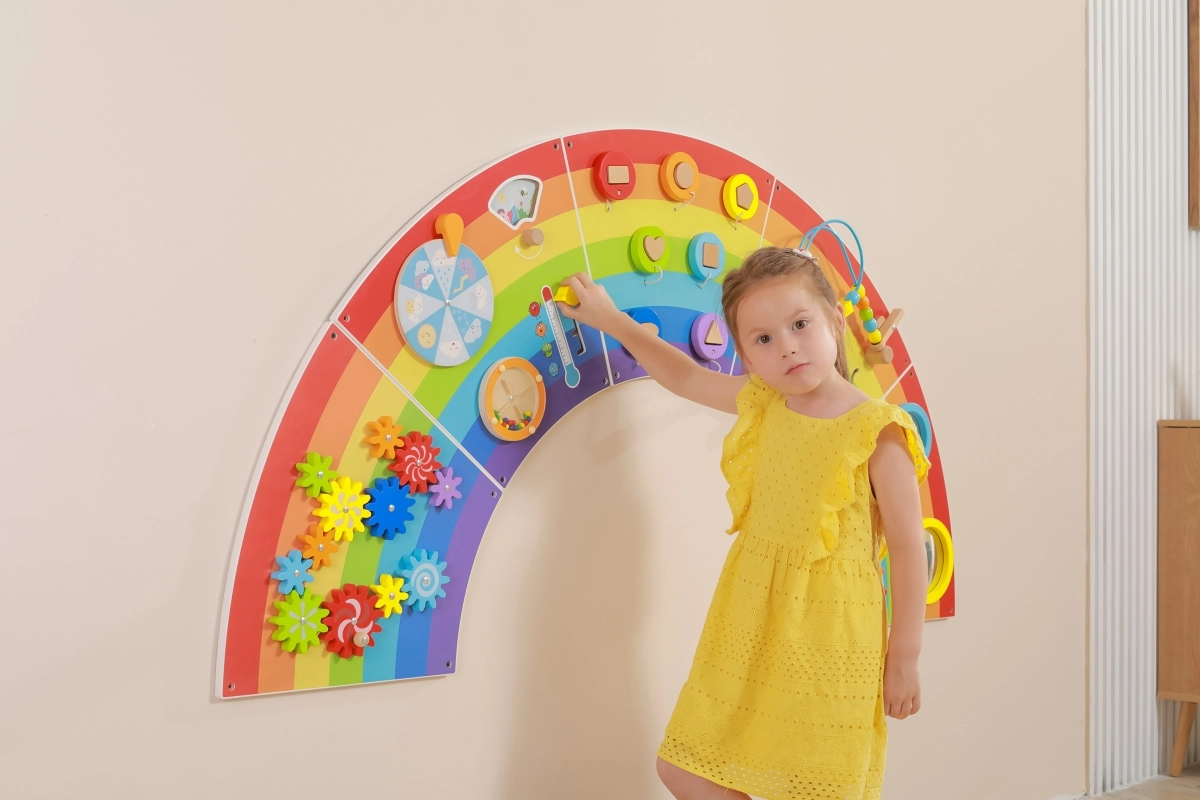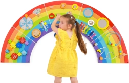 Este gran tablero de actividades con forma de arcoíris es un elemento ideal para dormitorios infantiles, salas de juego y espacios educativos. Los niños pueden practicar de forma lúdica la coordinación ojo–mano, entrenar la paciencia y descubrir colores, formas, sonidos e incluso el clima. Su forma curvada favorece el juego simultáneo de niños de diferentes estaturas.