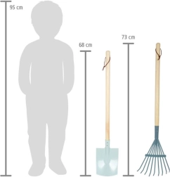 Cada pieza está fabricada con una combinación de madera y metal para una larga vida útil. Las presillas en los mangos permiten colgar y guardar fácilmente. Úsalo en parterres y césped, así como en el arenero o la playa.