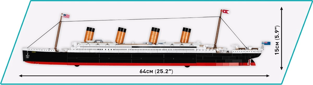 Este set de construcción de bloques COBI reproduce fielmente la silueta y las proporciones del legendario transatlántico RMS Titanic. Una vez montado, el modelo mide aproximadamente 64 cm de largo y 15 cm de alto, destacando tanto en una habitación infantil como en la colección de un amante de la historia naval.