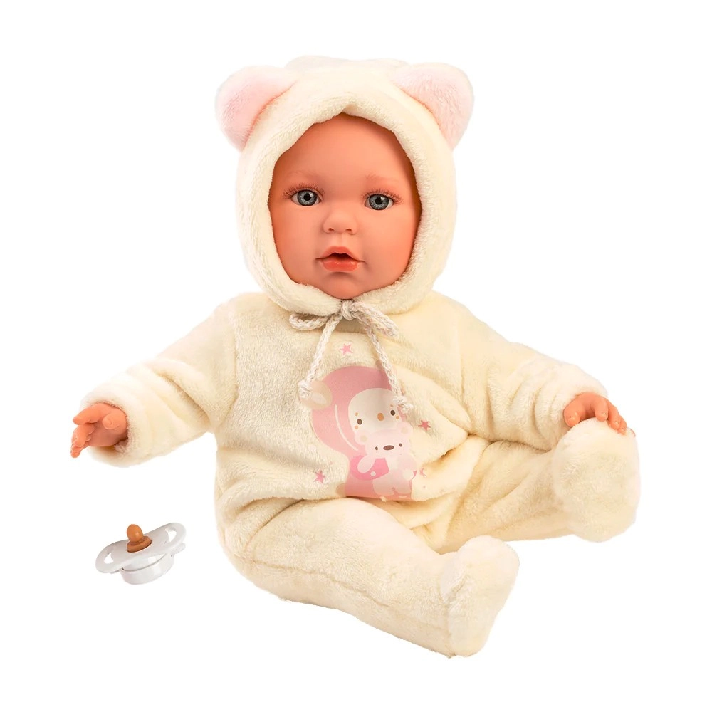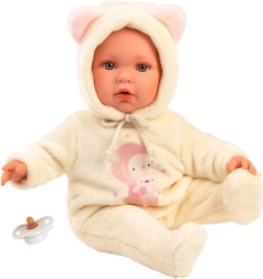 La muñeca bebé Julia de 42 cm está cuidadosamente elaborada en el tradicional taller español de Llorens. Gracias a su acabado artesanal, resulta extraordinariamente realista: las sombras suaves, las bonitas pestañas y los ojos aportan a la muñeca una expresión viva. La barriguita de algodón suave invita a abrazarla, mientras que los brazos, piernas y cabeza de vinilo ofrecen una sensación auténtica durante el juego.