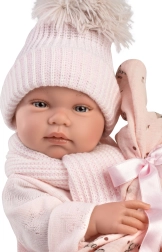 La muñeca se puede bañar con cuidado con las pestañas. Incluye chupete y un suave conjunto rosa con mantita.