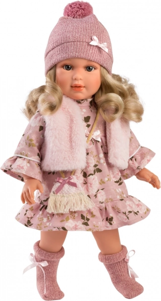 El set también incluye un elegante sombrero con pompón, bufanda y un pequeño bolso que completan el conjunto.