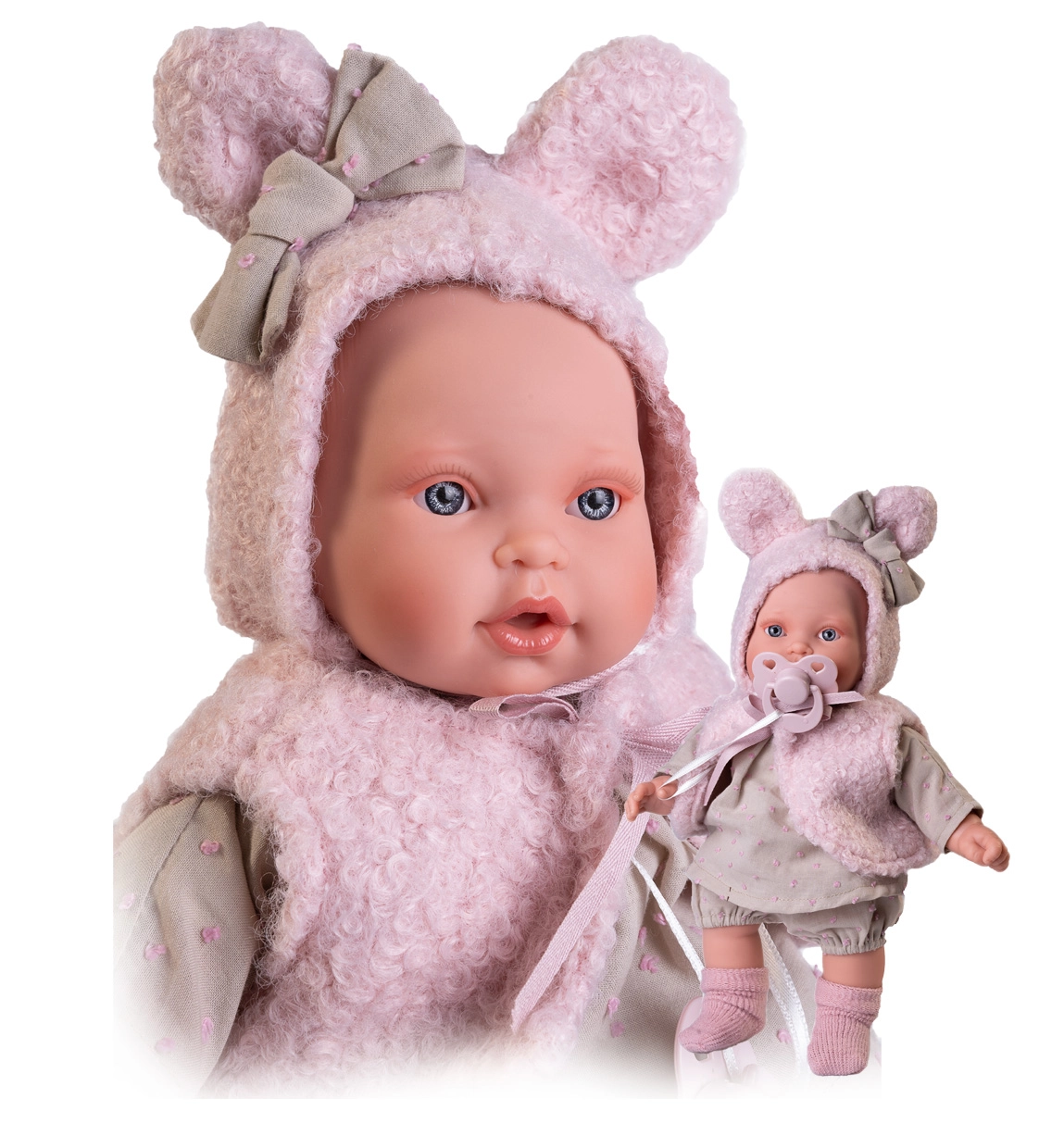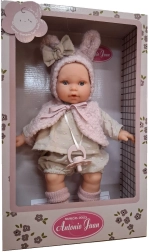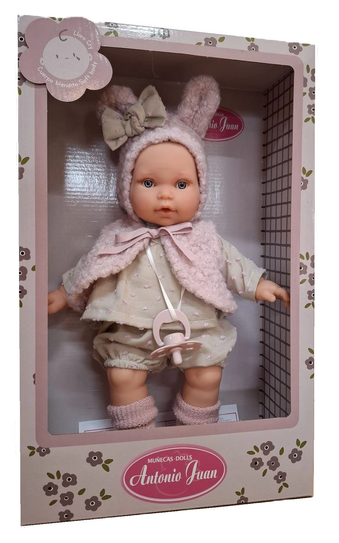La adorable muñeca Antonio Juan Kika de 27 cm es como un bebé de verdad: tiene cuerpo blandito de tela, cabeza y extremidades de vinilo, reacciona al chupete magnético y al retirarlo llora y dice “mamá”, “papá”. Se entrega en caja de regalo, está hecha a mano y parte de la ropita es de algodón orgánico. Apta a partir de 2 años.