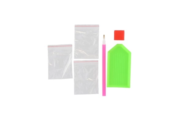 - Equipo completo: lienzo con leyenda, bolígrafo aplicador, bandeja, cera, set de piedras de colores.